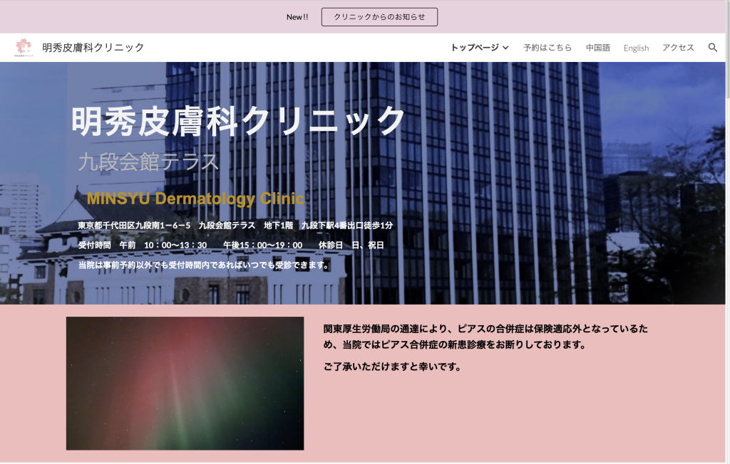 明秀皮膚科クリニックは、東京メトロ九段下駅より徒歩1分という通いやすい場所にあり、月曜〜土曜は夜19時まで診療を行っているクリニックです。事前予約以外でも受付時間内であれば受診できるため、仕事帰りに受診したい方でも立ち寄りやすくなっています。